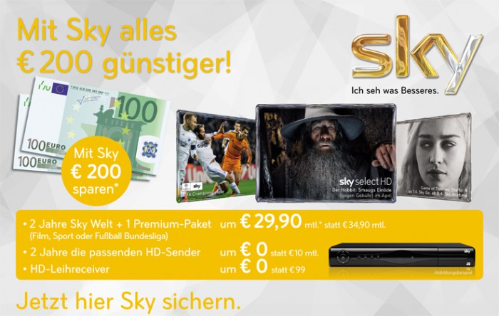 * 24 Monate Mindestvertragslaufzeit (Monat der Freischaltung [anteilig] zzgl. 23 Kalendermonate). Bei Aboabschluss mit Sky Welt und 1 Premium-Paket (Film, Sport oder Fußball Bundesliga) sowie den passenden HD-Sendern um €29,90 mtl., zzgl. €39 Aktivierungsgebühr erhalten Sie zusätzlich ein Produkt Ihrer Wahl um €200 günstiger. Keine Barablöse möglich. Ab dem 25. Monat sind Abogebühren von €44,90 mtl. zu entrichten. Programmangebot über Kabel abhängig vom Kabelnetzbetreiber. Die Servicepauschale für den HD-Leihreceiver beträgt €0, der Receiver bleibt im Eigentum von Sky. Angebot nicht gültig bei UPC. Angebot gültig bis 30.6.2014. © Gepa, © 2013 Warner Bros. Entertainment Inc. © 2014 Home Box Office, Inc. All rights reserved.